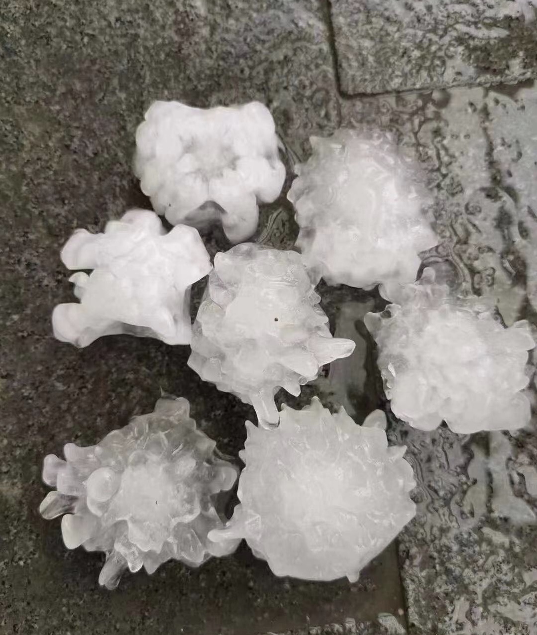 风雨掺杂冰雹打在地面和棚子上发出很大的声音 从网友分享的图片和视频来看冰雹的个头与大颗葡萄等同 昌平网友小乐描述因下着冰雹他走的那段路除了几棵树以外没有任何遮挡物我撑着伞被冰雹砸得都快握不住了还有几个冰雹隔着伞砸我脑袋上了真的疼.